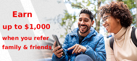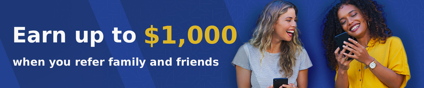 Sign up and use our referral portal and share your code. You can check to see how your friends and family are doing inside your online banking account. For each referred member completes all the activities using your promo code within 90 days of opening their account, you will receive a $100 bonus in your checking account automatically — up to $1,000 per year!